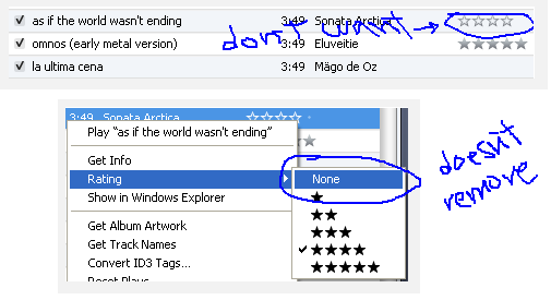 I use the iTunes ratings quite extensively for organizing my music collection with smart playlists. Of late I started seeing some songs I had never rated in my smart playlists and they show up with grey stars in iTunes that can’t be removed from the song directly. On the iPod/iPhone/iPad it’s even worse as they show up as normal ratings making you wonder how your library got messed up.