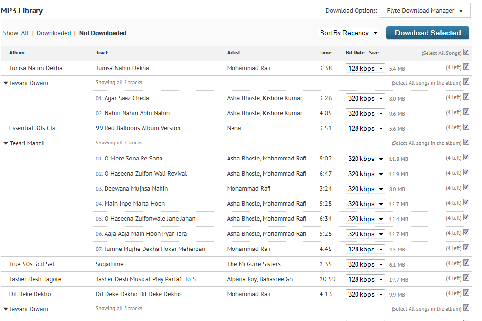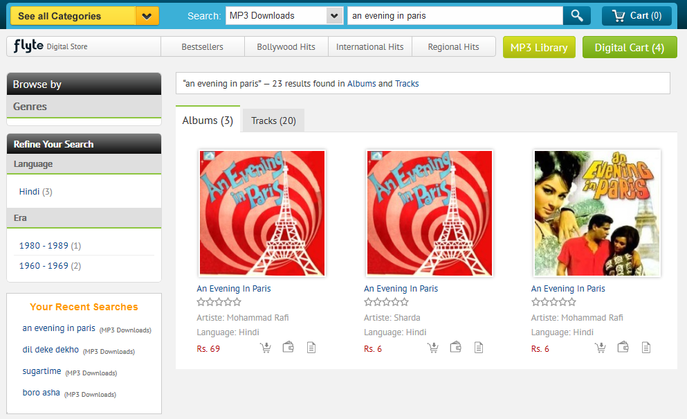 Price: The prices start at Rs 6 per track, which is for mostly oldies (there are some costing Rs 9 too). Most of the new Indian tracks and the International ones cost Rs 15. The highest I’ve seen so far is Rs 45 for some of the longer International tracks (Star Wars tracks for ex.). Entire albums, as expected, turn out to be cheaper than purchasing every track separately. Most tracks are also available in 3 different bitrates – 320, 128 & 64 kbps (not all oldies have 320 kbps versions though) which gives you flexibility in the bandwidth, storage and quality department.