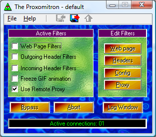 1) Start Proxomitron and uncheck the filters (you could leave them checked if you want to use the filtering capabilities, but that adds an overhead to your system) & check the “Use remote proxy” option